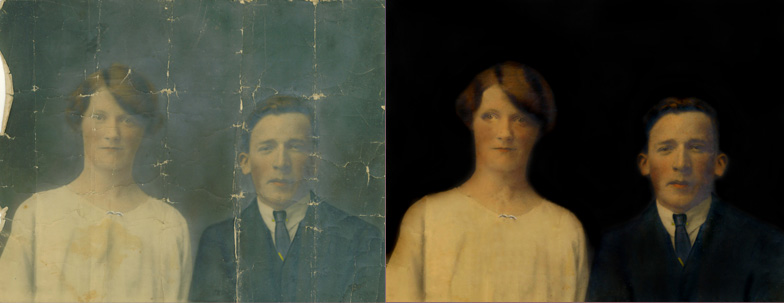 Using skill, appropriate techniques and equipment iolaire™ can restore much of the damage that occurs when photographs have been handled over decades. Tears and holes can be digitally fixed, discolouration remedied and other such repairs effected to improve the image.